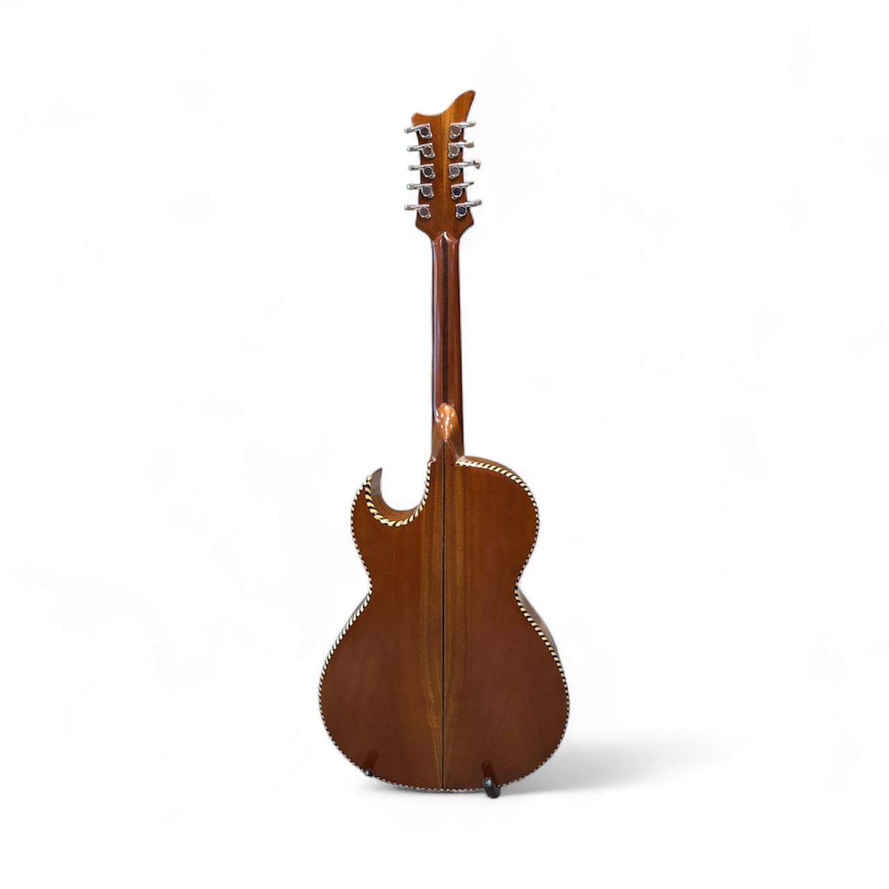 Su construcción artesanal en Paracho, Michoacán, garantiza calidad en cada detalle, desde el cuerpo robusto hasta los acabados decorativos en la caja y mástil.